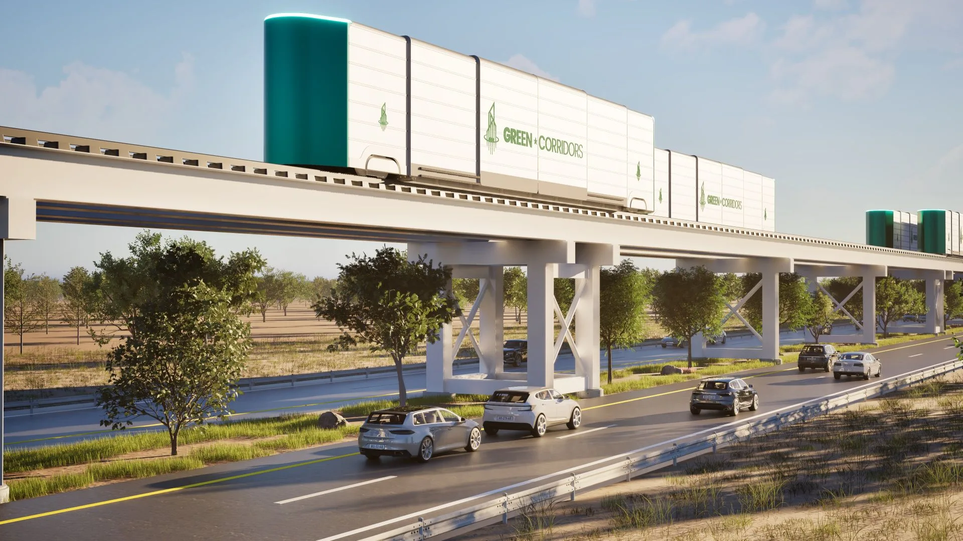 Green Corridors está revolucionando el transporte de mercancías con su sistema de transporte inteligente, completamente autónomo y de propiedad industrial. El sistema alivia el congestionamiento del tráfico al trasladar la carga de las carreteras a guías elevadas, aumentando la eficiencia, la sostenibilidad, la seguridad y la seguridad vial.
